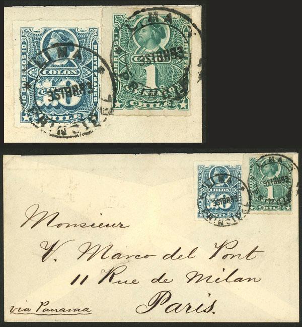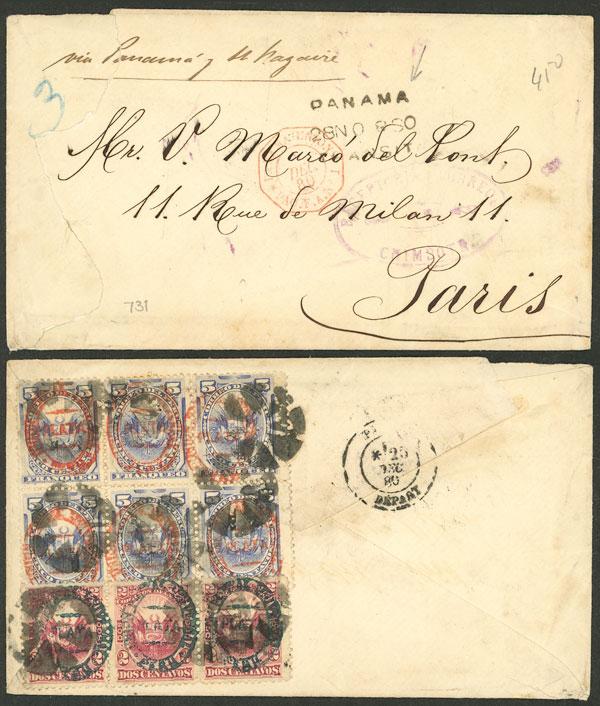 TRIPLE RATING: Cover sent from Chimbote to France in NO/1880 franked on back 36c. with stamps overprinted "PLATA-PERU", it bears a transit mark of Panama 28/NO and Paris arrival for 25/DE, very rare, VF quality, ex-Herbert Moll. (Image)