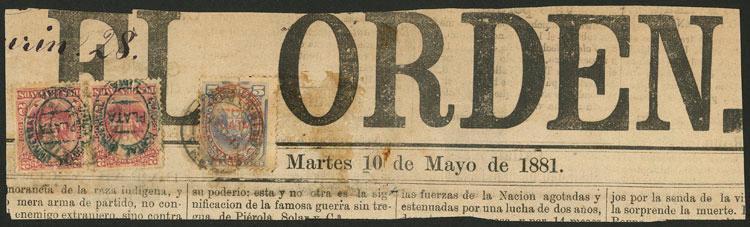 Nice franking on fragment of a newspaper dated in Lima 10/MAY/1881, possibly sent abroad (one stamp of the original postage seems to be missing), extremely rare during the Chilean occupation, very decorative! (Image)