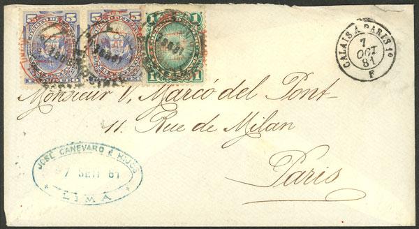 7/SE/1881 Lima to France, cover franked with 11c., stamps overprinted "PLATA-LIMA", with Paris arrival mark of 7/OC, excellent quality, ex-Herbert Moll (Image)