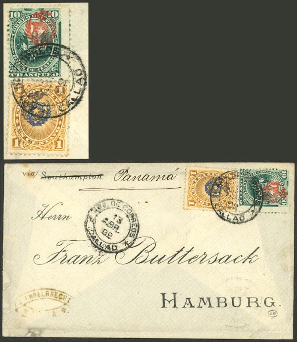 WAR OF THE PACIFIC: Cover sent during the Chilean occupation, on 13/AP/1882 from Callao to Germany franked with 11c. (Sc.N11 + N16), arrival backstamp, excellent quality and very rare, few known covers with these stamps! (Image)