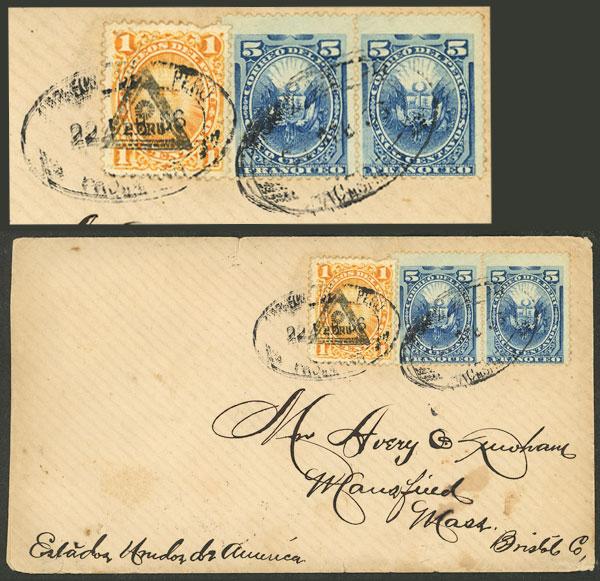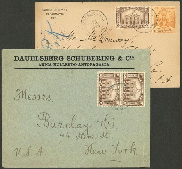 Cover sent from Pacasmayo to USA on 19/DE/1898 franked with 22c. (double rating), on back transit mark of Paita and arrival + another cover with reduced rate of commercial papers sent to New York with 4c. (pair Sc.155), both of very fine quality! (Image)