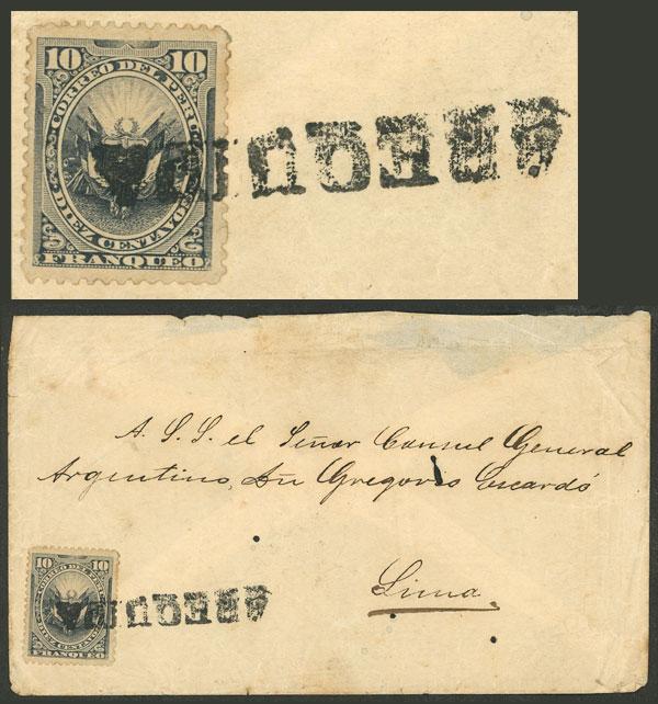 Cover sent to Lima franked with 10c., straightline "AREQUIPA" cancel, on back arrival mark of 19/MAR/1887, with some small moth holes but of very fine appearance, rare! (Image)