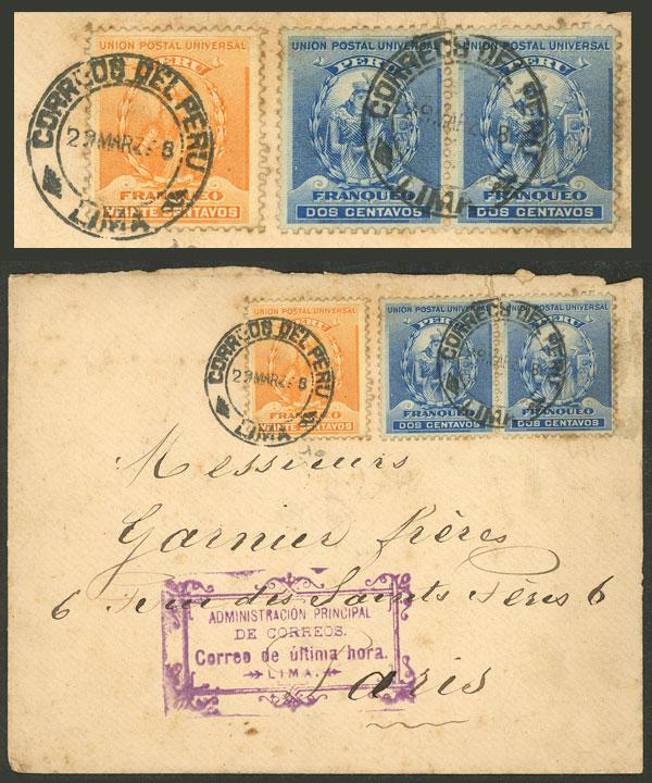 LAST MINUTE RATE: Cover sent from Lima to Paris on 29/MAR/1898 franked with 24c. which includes 2c. for a last-minute mailing, with a violet mark indicating the type of dispatch, and arrival backstamp, VF quality! (Image)