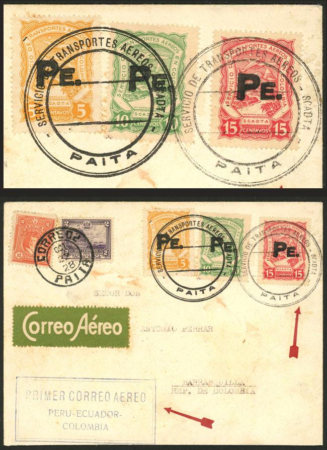 22/OC/1928 First flight Peru - Ecuador - Colombia, cover franked with 12c. definitives + airmail fee with SCADTA stamps overprinted "PE.", sent from Paita to Barranquilla (with arrival backstamp of 25/OC), very fine quality! (Image)