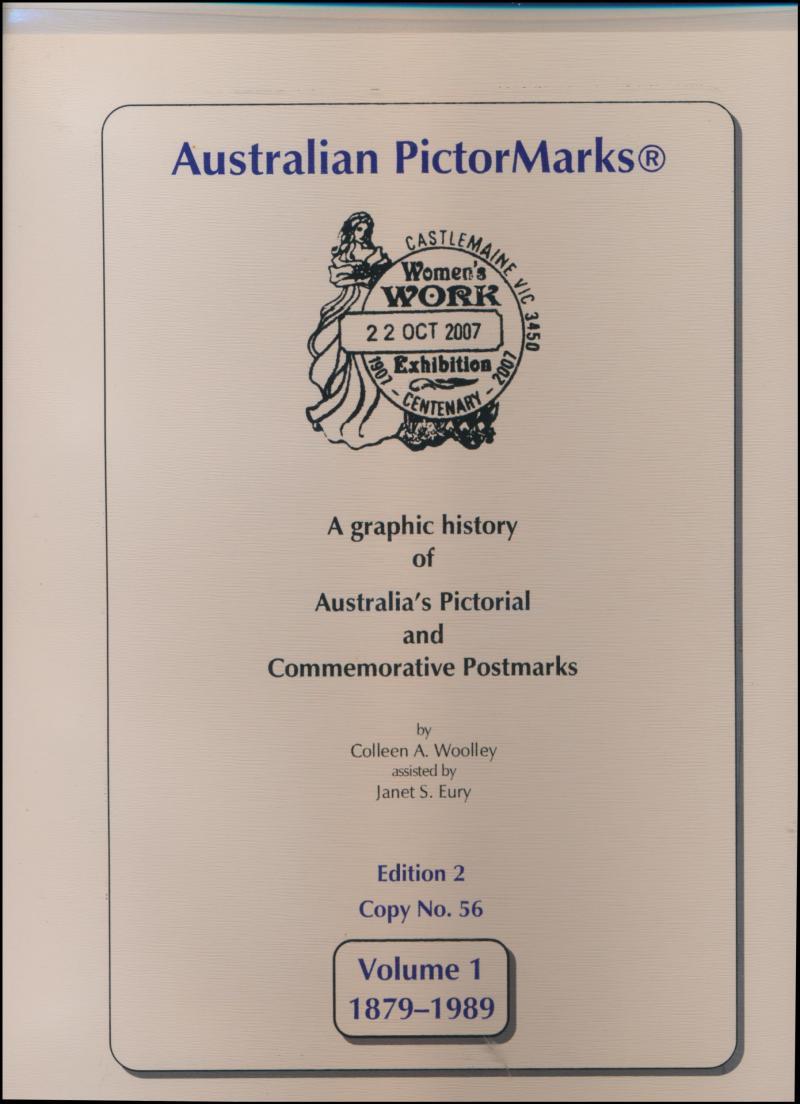 AUSTRALIA: 'Australian PictorMarks: A Graphic History of Australia's Pictorial and Commemorative Postmarks' by J Eury & C Woolley, 2nd Edition (2013), 1000+pp, loose-leaf, in 2 binders, plus an earlier 1987 version. Weighs 6kg.