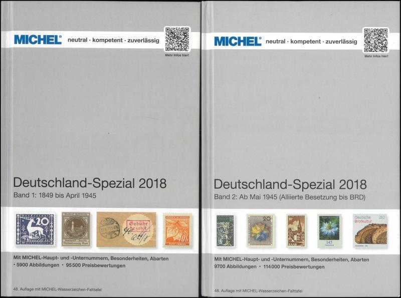 GERMANY: Predominantly Michel catalogues from 2009 to 2021 including 2018 Specialised Vols 1 and 2; plus 'The Stamps of the German Empire' (Poole, originally published 1914), 'German Colonies: Catalogue of the Postmarks' (English Edition 2019), and 'Philately of Third Reich Germany 1933-1945' (Jones, 2011). Weighs 10kg.