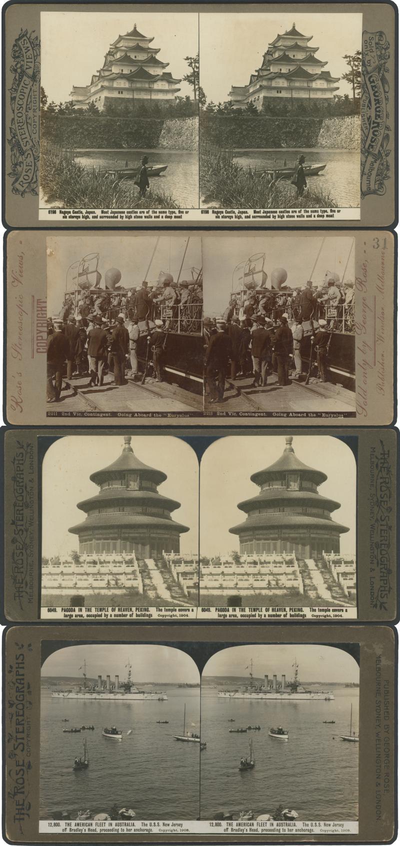 The Rose Stereograph Company Extensive collection 1880s-1940 in 21 wooden cases with 3500+ stereograph views in numerical order, together with the book 'George Rose - Australia's Master Stereographer' by Ron Blum (signed) & 16 folders of notes. Subjects include Victoria (750+), Boer War, Commonwealth Celebrations, Duke of York Visit, Coronation of King Edward VII, Delhi Durbar, London, England, Switzerland, Germany, Italy, India, China, Japan, Korea, New Zealand, Tasmania, Egypt, Ceylon, Singapore, NSW, Queensland, Scotland, Wales, Ireland, Funeral of King Edward VII, Coronation of King George V, Investiture of Prince of Wales, Suffragettes, Fiji, Solomon Islands, Papua, New Caledonia, 1908 American Fleet Visit, WW1, Hawaii, USA, Canada, Monaco, Norway, France, Gibraltar, Spain, Belgium, Egypt, Tunisia, Algeria, Morocco & Palestine. Mainly Fine/Very Fine. A life-long collection, one of the most complete collections of Rose Stereographs ever assembled.