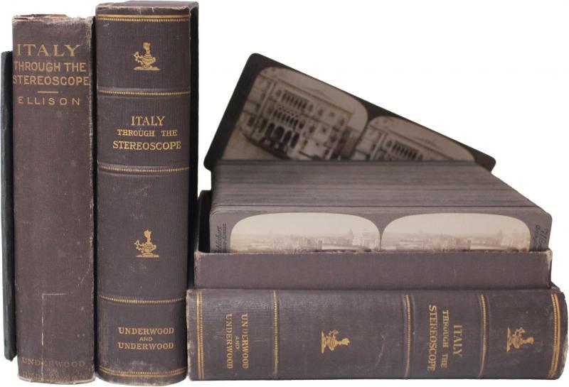 Stereographs 'Italy Through the Stereoscope' by Underwood and Underwood, complete set of 100 stereographs housed in case that looks like two books; plus book 'Italy Through the Stereoscope' by Ellison [New York, 1908] with 'Maps and Plans' booklet housed in sleeve, Fine condition.
