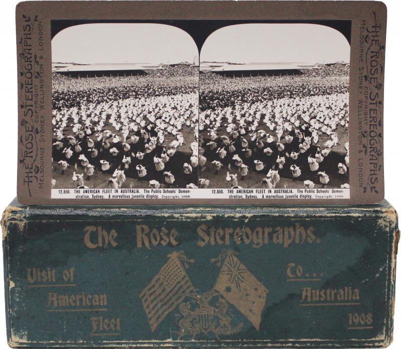 Stereographs 'Visit of American Fleet 1908' by Rose Stereographs, complete set of 100 views housed in four boxes with gilt 'The Rose Stereographs. Visit of American Fleet to Australia 1908', mainly Fine condition.