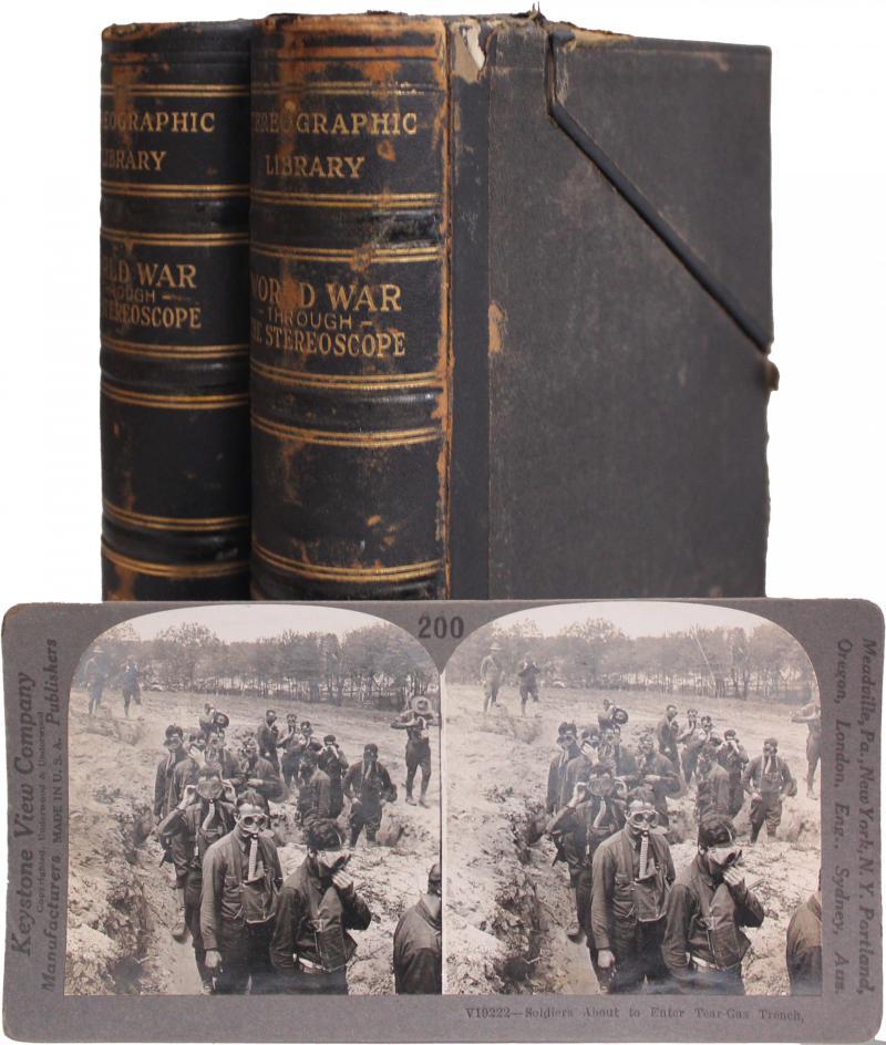 Stereographs 'World War Through the Stereoscope' by Keystone View Co, complete set of 100 views numbered #200-300, housed in case that looks like a pair of books with 'Vol.V' & 'Vol.VI' on spines, mainly Fair/Fine condition.