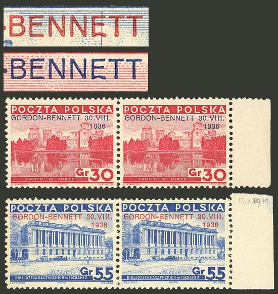 Yvert 390A + 390B, 1936 Gordon-Bennett balloon race, pairs, MNH, the left stamps in each pair with variety: "second E of BENNETT curved below", excellent! (Image)