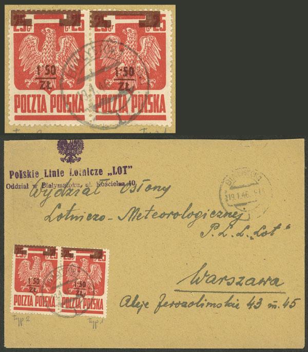 Sc.346, 1945 1.50Zl. on 25gr., pair formed by overprint types I and II (view the dot between "1" and "50"), franking a cover used on 19/JA/1946, VF quality! (Image)