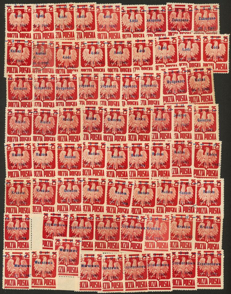 Yvert 439, 1945 Liberation of several cities, 10 values with different overprints (Sc.347/356), several of each, mint, several MNH, some used, very few without gum, good lot to study the different types of overprints, very fine general quality! (Image)