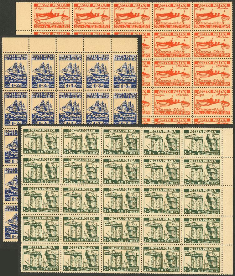 Yvert 446A + 446B + 446D, 1945 Danzig bridge, 3 values of the set of 4 (including the scarce 50g.) in MNH blocks of 25, excellent quality! Yvert catalog value Euros 500 (Image)