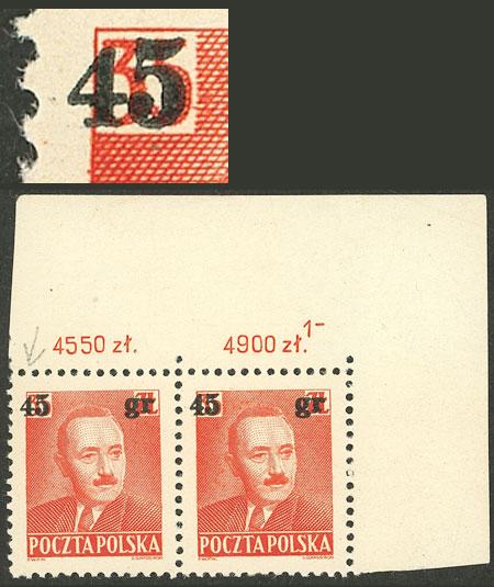 Yvert 620, 1951 45gr. on 35z., pair, the left stamp with VARIETY: "4 of 45 fallen", VF quality! (Image)