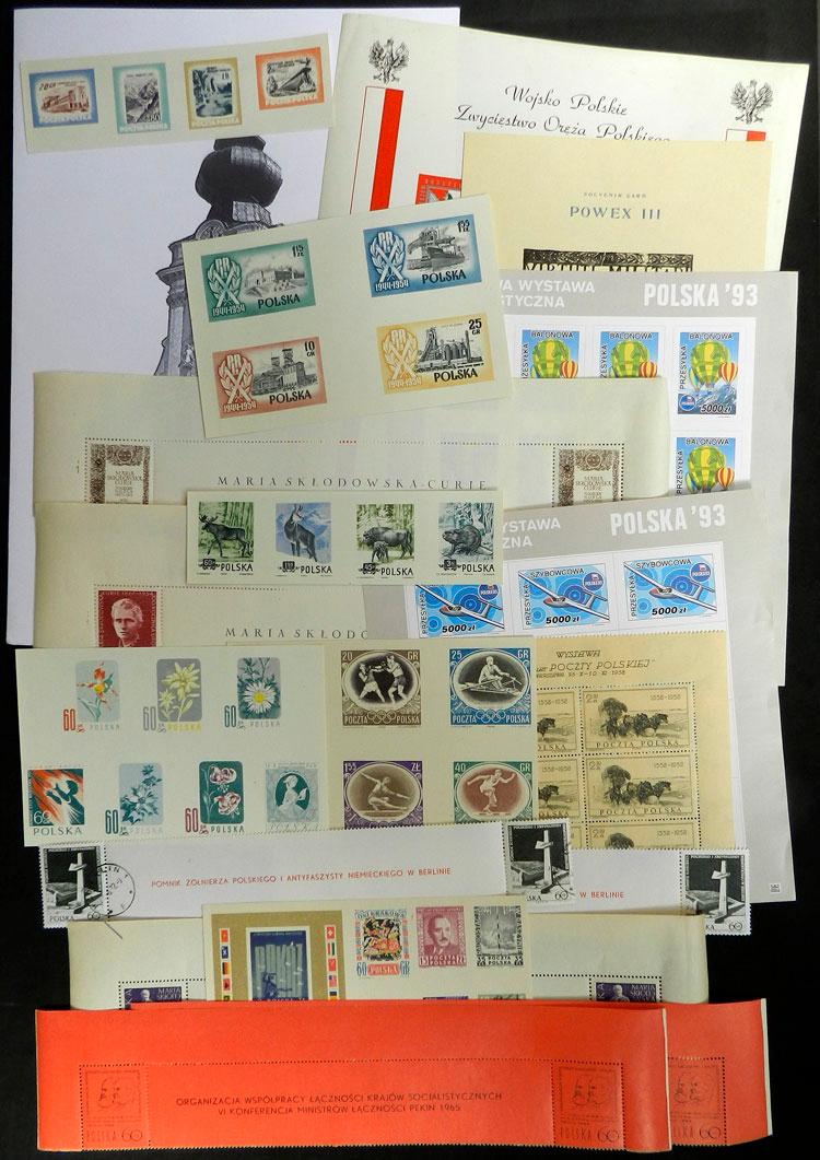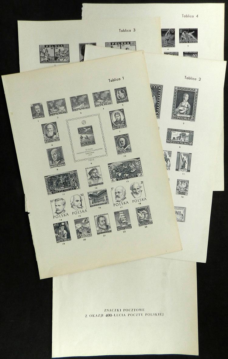 Folder of year 1958 commemorating 400 years of Polish Post, with souvenir sheet and set of 6 values, and other 4 sheets with stamp reprints in black, interesting! IMPORTANT: Please view ALL the photos of the lot, because all the material has been scanned (Image)