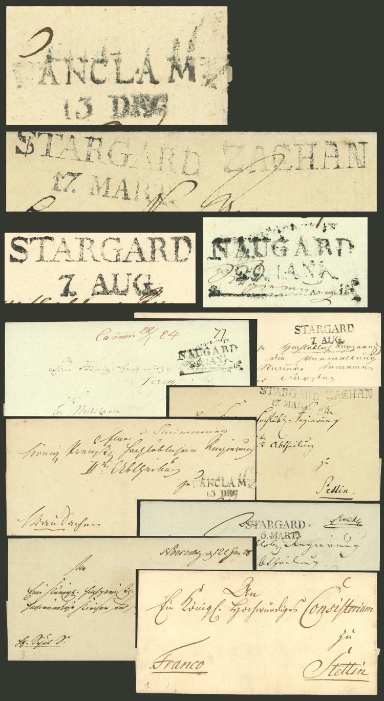 Circa 1825, 7 folded covers sent to Stettin, 5 with pre-philatelic marks: "STARGARD", "NAUGARD", "ZACHAN" and "ANCLAM", excellent quality, very attractive lot! (Image)