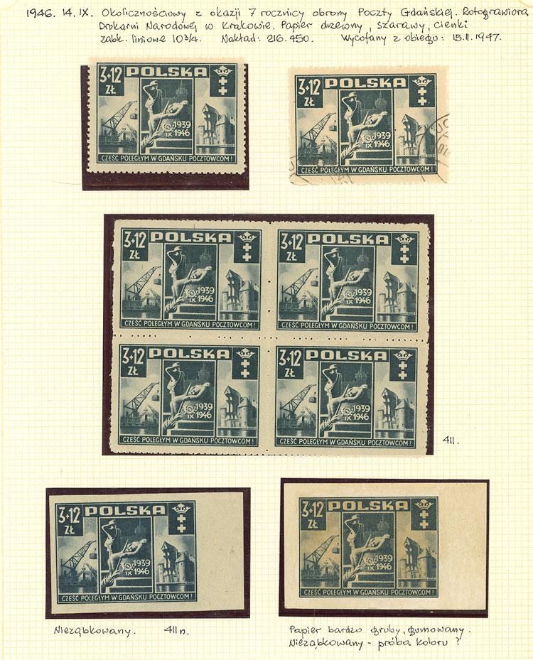 Yvert 471, 1946 Defence of Danzig post office, development of the issue on 3 album pages, including 2 imperforate examples with good sheet margin (MNH perfect), one with double perforation, etc, very good lot, excellent quality, good opportunity! IMPORTANT: Please view ALL the photos of the lot, because all the material has been scanned. (Image)