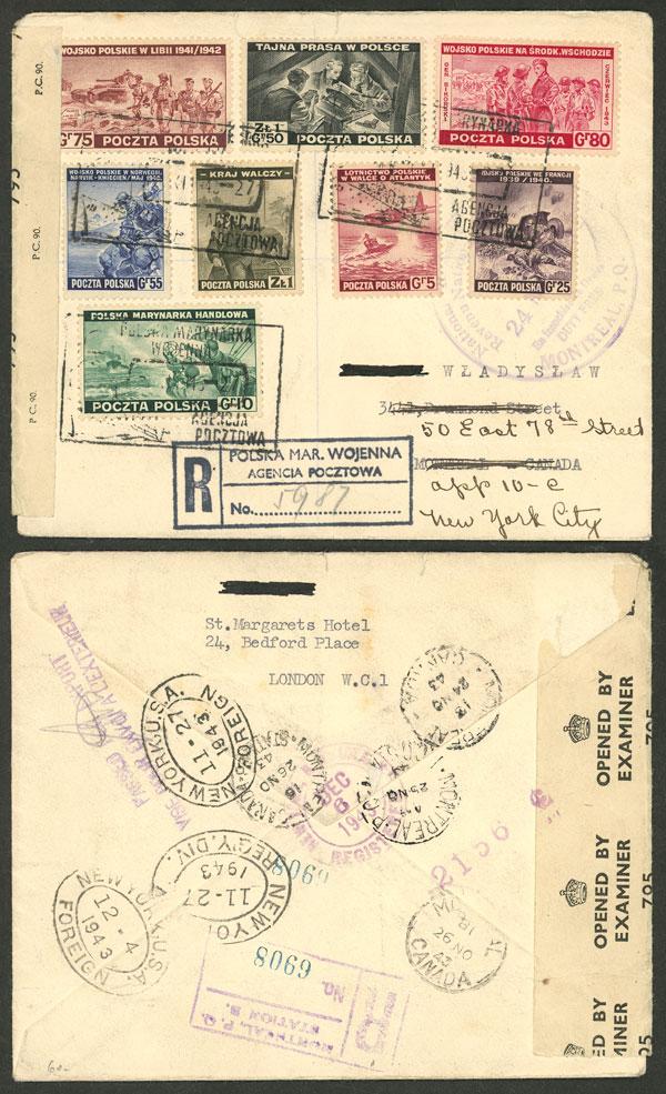 Sc.3K9/3K16, 1943 set of 8 values franking a registered cover sent to Canada on 3/NO/1943 and forwarded to USA, with English and Canadian censorship, several marks on front and back, very attractive! (Image)