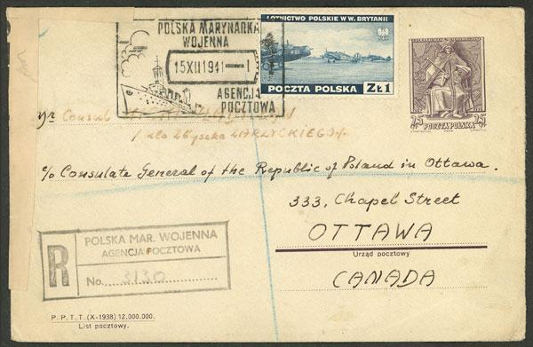 25gr. Postal stationery + one stamp of the Government in Exile of 1Z. (Sc.3K7), sent to Canada on 15/DE/1941 (first day of issue), with English censor label and arrival backstamp, VF! (Image)