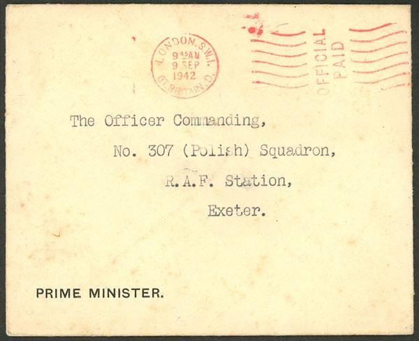 Official cover of the British Prime Minister sent from London to the Officer Commanding the Polish Squadron in Exeter on 9/SE/1942, VF quality! (Image)
