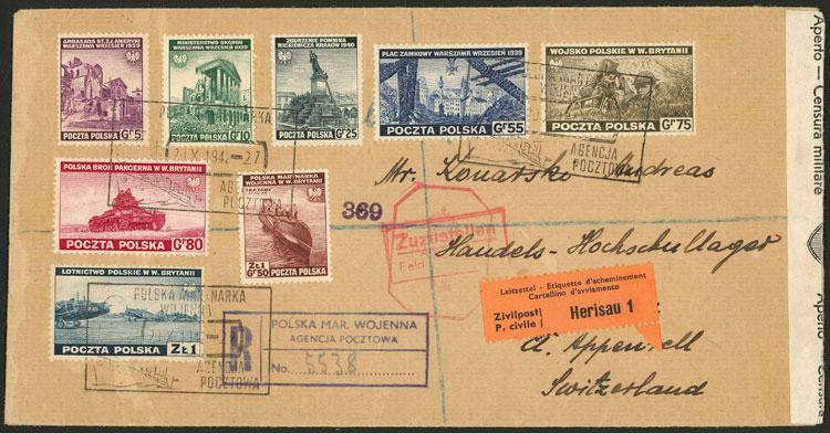 20/OC/1942 London - Switzerland, cover franked with the issue of 8 values of the year 1941 (Yvert 1/8), sent by registered mail, it bears several postal marks and labels, also a Swiss censor label and arrival backstamp of 18/NO, VF quality! (Image)