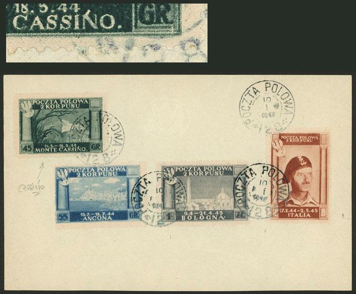 Sassone 1/4, 1946 the set of 4 values in a special sheet cancelled on 10/JA/1946, the stamp of 45gr. has a VARIETY: "Accent over the N of CASSINO", excellent quality! (Image)
