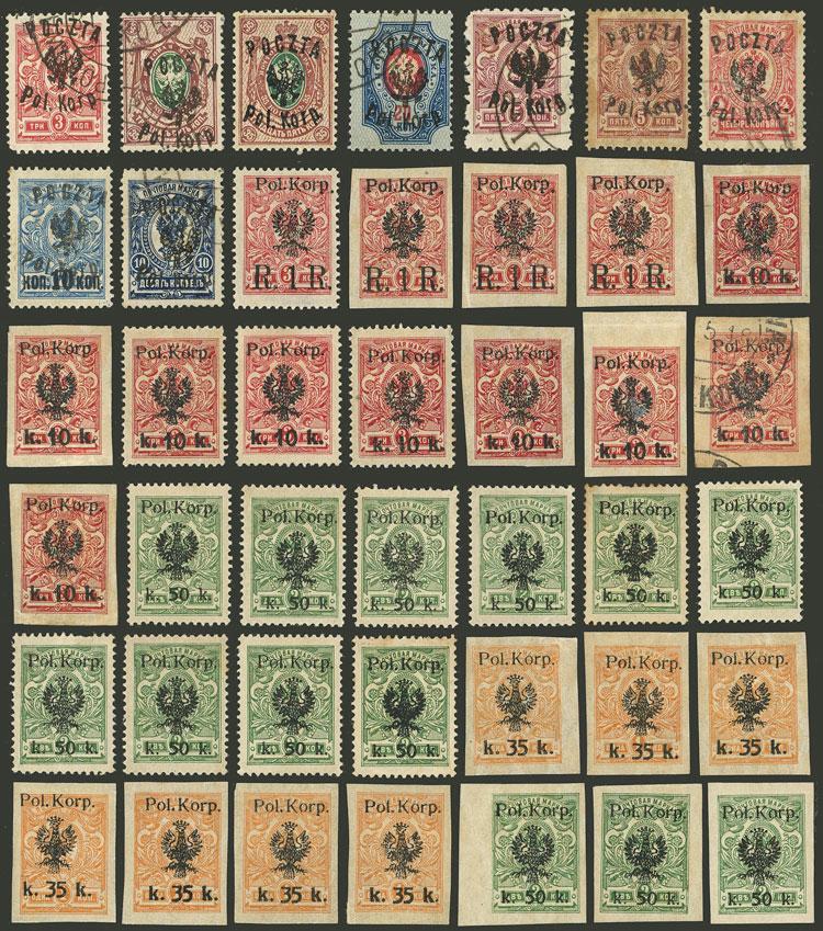 Interesting lot of stamps overprinted in 1918, used or mint, some with small marks or guarantee signatures on back, others could be forgeries (they have not been expertized, but they belonged to a Polish collector), in general of very fine quality. Sold as a lot, as is, good opportunity! (Image)