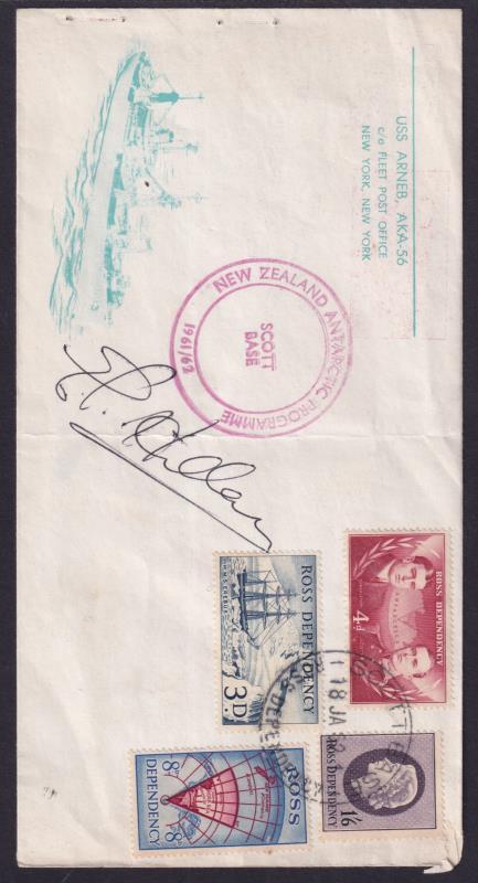 Ross Dep 1962 USS Arneb folded cover bearing Ed Hillary's signature, 1957 set canc 18 Jan 1962 Scott Base, with red N.Z.A.P. 1961/62 Scott Base cachet. Adhesions on rear + minor damage. (Image)