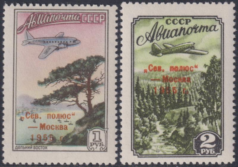 Russia 1955 1R, 2R Opening of North Pole Scientific Stations ovpt set of 2 1955 Air Pictorials. Scarce. SG 1921-2. Cat £36.50. MUH. (Image)