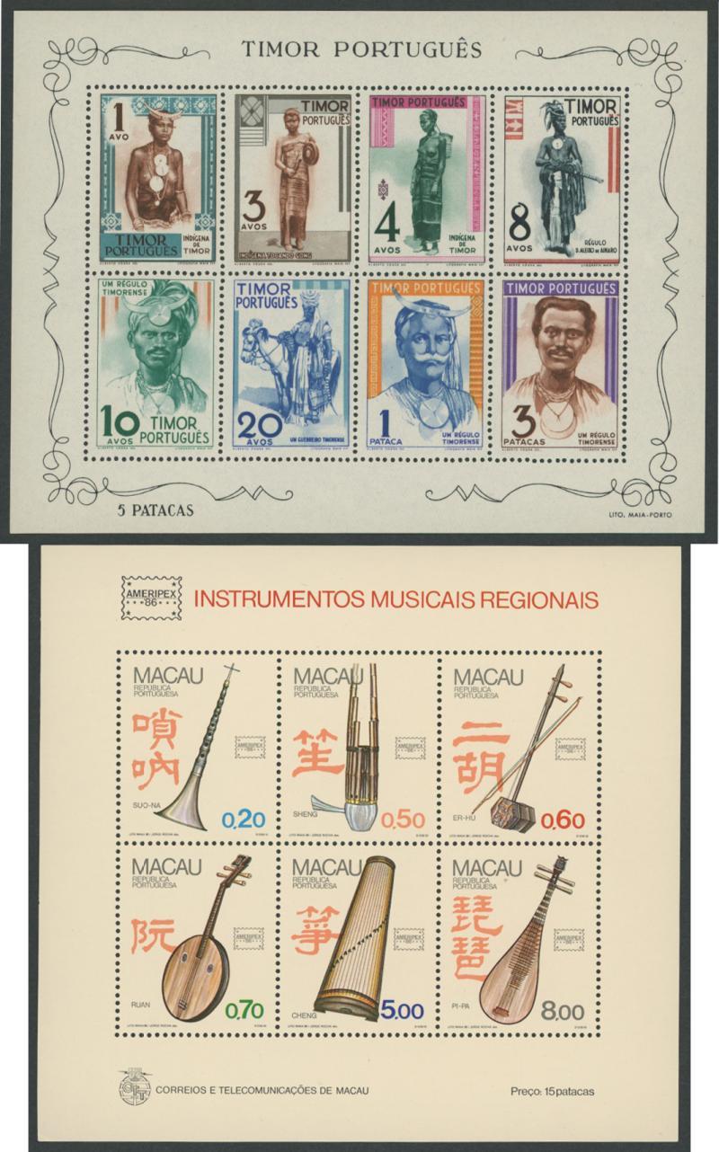 Minisheets selection comprising 1983 Medicinal Plants ** x2 & CTO on First Day of Issue, 1984 Post Centenary CTO on FDI, 1986 Ameripex Musical Instruments ** x2 & CTO on FDI x2, 1995 Music Festival ** x10, 1996 Legislative Assembly ** x10, and 1997 Lucky Numbers, Kwok Se Paintings & Drunken Dragon Festival ** x10 each, plus Timor 1948 Indigenous Peoples M/S, all including the CTO are unmounted, Cat £2700+.
