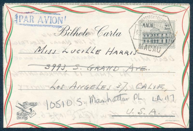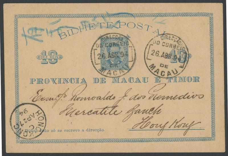 POSTAL HISTORY: 1894 (April 26) usage of Macau & Timor Postal Card 10c blue with 'MACAU' cds and lengthy personal message on reverse, to Hong Kong with very fine arrival cds of the next day, Chinese characters endorsement in blue pencil at upper-left, very fine. A lovely 'inter-island' usage at the foreign postcard rate. (Image1)