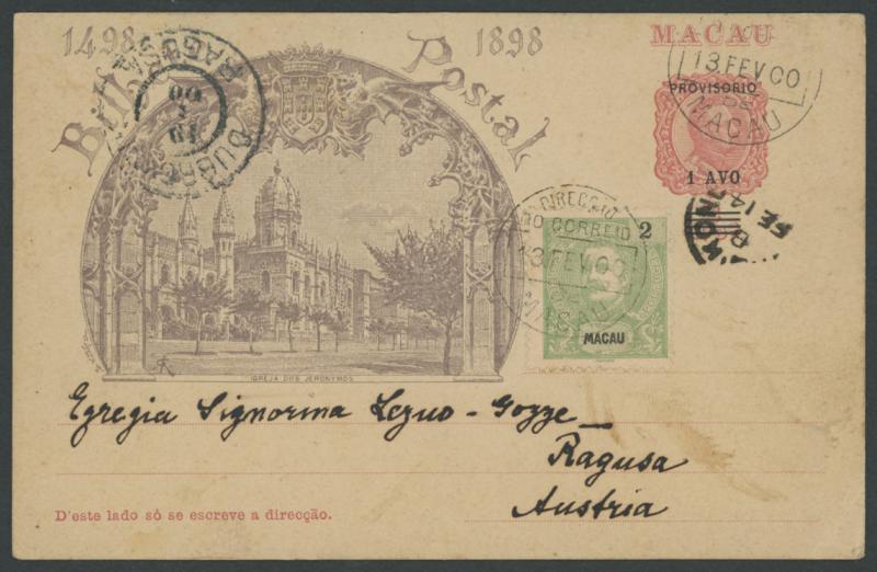 POSTAL HISTORY: 1900 (Feb 13) usage of Macau Scenic Postal Card 'Igreja dos Jeronymos' Church 2a red with 'PROVISORIO/ 1 AVO' overprint, to Austrian Dalmatia with short personal message on the reverse and King Luis 2a green added tied '.../MACAU' cds, partial Hong Kong transit of the next day, '.../RAGUSA' arrival cds also on the face, a couple of minor blemishes. (Image1)