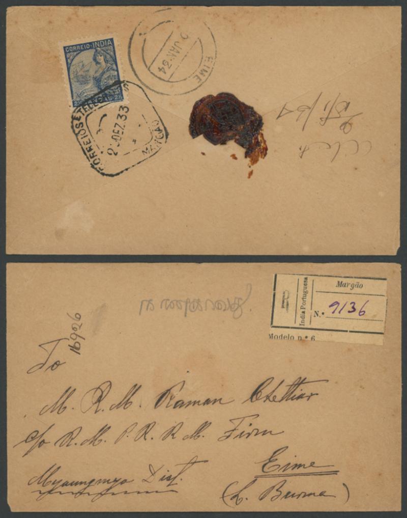 POSTAL HISTORY: 1934 (Dec 29) registered to "Eime, L[ower] Burma" with 2½a blue tied by 'CORREOS TELEGRAFOS/MARGAO' diamond datestamp and black/buff R label on the face, 'EIME/10 JAN 34' arrival cds, a few minor blemishes. A scarce origin/destination combination. (Image1)