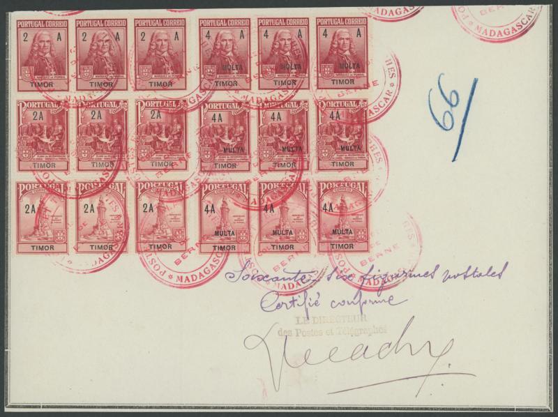 1925 Marquis de Pombal '2 A' Charity Tax Surcharges and 'MULTA' Postage Due Overprints set SG C231-C233 & D231-D233 strips of 3 tied to large piece from an archival ledger page by multiple strikes of the large 'POSTES ET TELEGRAPHS/COLLECTION DE BERNE/MADAGASCAR' triple-ring handstamp in rosine, signed by the Director of Posts at base, very fine. Our vendor paid £450.
