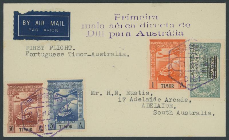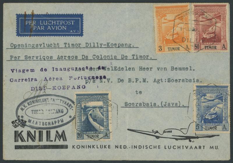 AEROPHILATELY: 1939 (Oct 4) Dili-Koepang (Netherlands Timor) KNILM first flight illustrated envelope with Map of KNILM routes on reverse (including to Port Darwin, Australia) and 'Viagem de Inauguracao da Carriera Aerea Portugueza/DILI-KOEPANG' cachet in violet, 'N.V.KONINKLIJKE PAKETVAART/ MAATSCHAPPIJ/TIMOR-KOEPANG' oval handstamp and Airmails 1a orange, 5a blue & 50a red-brown tied by three light but legible strikes of '.../DILLY' hexagonal datestamps, light fold clear of the stamps & markings and small paperclip rust-spot at upper-left. (Image1)