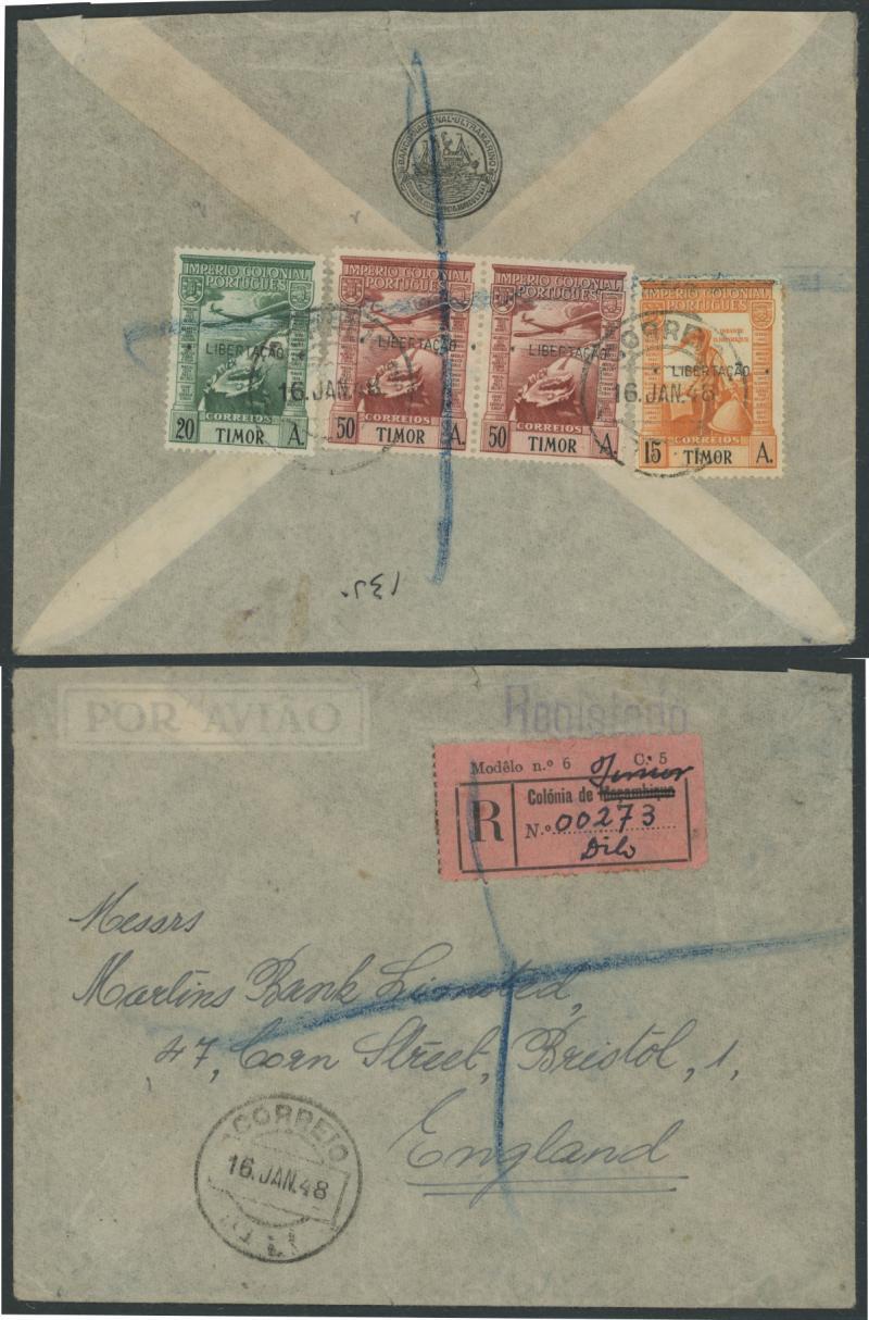 POSTAL HISTORY: 1948 (Jan 16) Banco Nacional Ultramarino envelope with 'Ship' logo on back flap, registered airmail to England franked on the reverse with 'LIBERTACAO' overprints Postage 15a orange and Airmails 20a green & 50a red-brown pair tied by 'CORREIO/DILI' cds cancels, provisional use of Mozambique black/pink R label affixed on the face with 'Mocambique' crossed out and "Timor / Dili" manuscript amendment, slightly trimmed at top not affecting stamps or markings. (Image1)