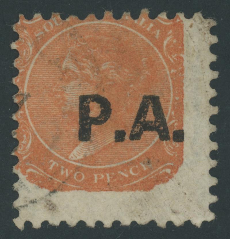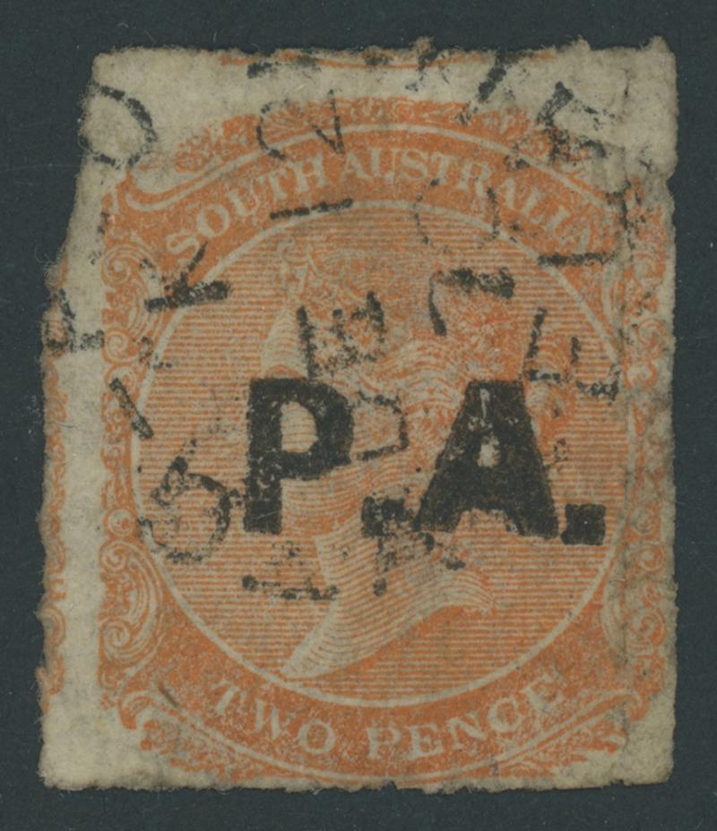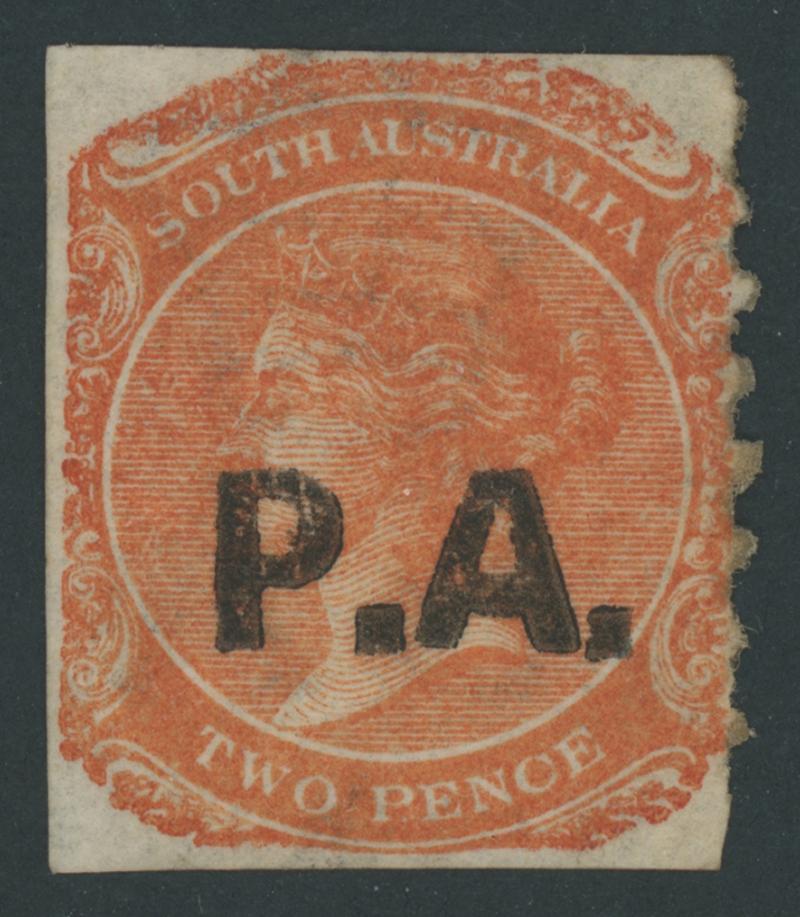 BLACK OVERPRINT: 'P.A.' on QV De La Rue Crown/SA Wmk Rouletted 2d red-orange SG DO402, rouletting at left and otherwise cut from the sheet just clear of the design, partial gum, Cat £1450. Rated RRRRR. Ex Baron von Ferrary, Theodore Champion and Philip Croker. Chris Ceremuga Certificate (2009) states "extremely rare". Don Pearce's similar example sold for $2515 (Sale 247 Lot 629). Absent from 'Besancon'. (Image1)