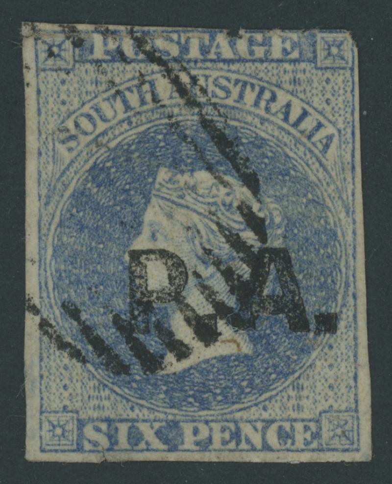 BLACK OVERPRINT: 'P.A.' on QV Perkins Bacon Large Star Wmk Rouletted 6d ultramarine SG DO403, rouletting clear of the design at right & base and cut from the sheet at top and left also clear of the design, large-part gum, Cat £2250. Rated RRR. Ex Colonel Napier (I). RPSV Certificate (1979). Rodney Attwood's very fine example sold for $1865 (Sale 168 Lot 417). The superb 'Besancon' example sold for SFr2905. Superior to Don Pearce's unused example - tiny nick at the top - that sold for $2275 (Sale 247 Lot 633). (Image1)