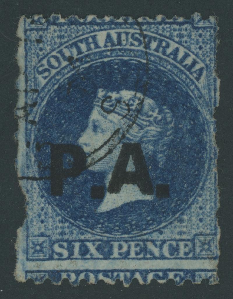 BLACK OVERPRINT: 'P.A.' on QV Perkins Bacon Large Star Wmk Perf 11½-12½xRouletted 6d Prussian blue SG DO404, significant separation fault at lower-left, GPO cds of 'AP1/74', Cat £1500. Unlisted by Ron Butler and the only example known to us so it should be rated RRRRRR. Ex Don Pearce: sold for $1915 (Sale 247 Lot 634). A unique stamp that, despite the fault, is still far more attractive than the cut-to-shape British Guiana 1c black/magenta. (Image1)