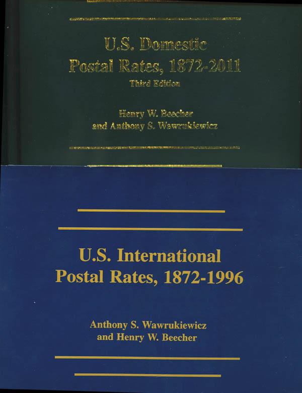 Beecher & Wawrukiewicz,U.S. Domestic Postal Rates 1872-2011, published 2011, hard bound, 463 pages, very detailed, with illustrations in black & white. Also the companion volume, U.S. International Postal Rates 1872-1996, 402 pages, paper back. Shipping weight 7.75 lbs / 3.5 kilos. Estimate $40 - 60. Suggested Bid $40-60 (Image)