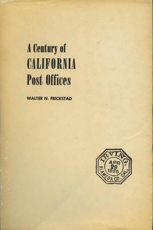Frickstad, Walter N.,A Century of California Post Offices: 1848-1954, published in 1955, paperback, 395 pages, no illustrations but very detailed listings by county and post office. Slightly worn.Shipping weight 1.3 lbs / 0.6 kilos. Estimate $20 - 30. Suggested Bid $20-30 (Image)
