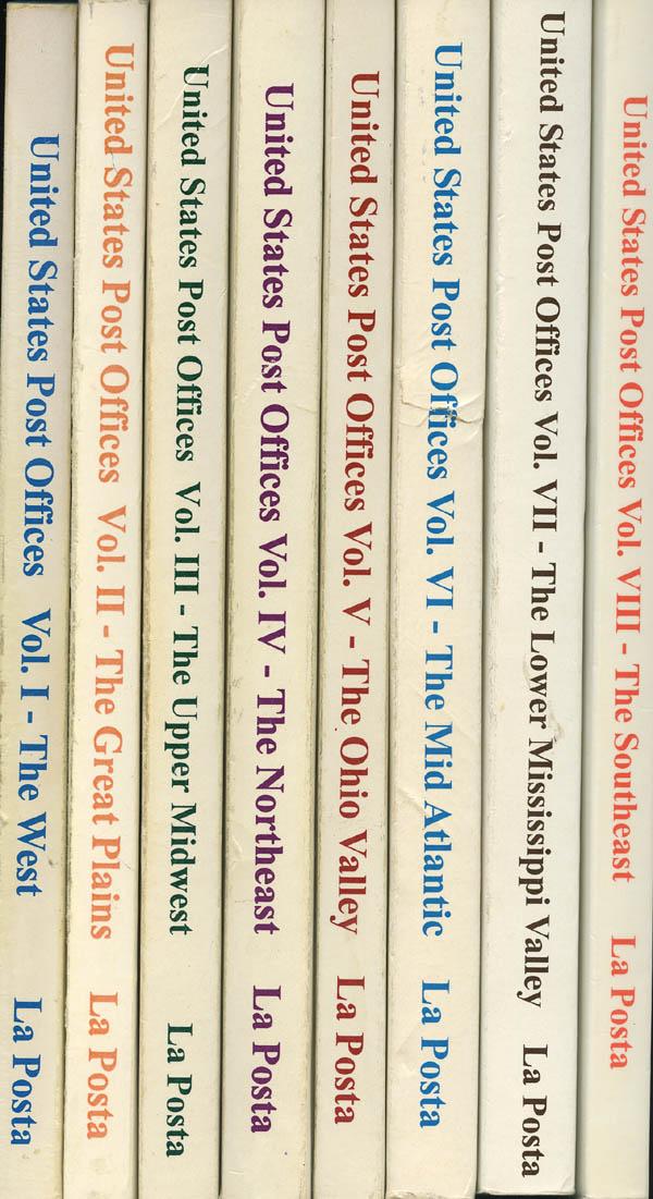 Helbock, Richard W.,U.S. Post Offices, published 1993-2007, plate block, 8 volumes, few illustrations but an extremely detailed listing of post offices, their dates of operation and a scarcity index. Nearly new. Shipping weight 5.5 lbs / 2.5 kilos. Estimate $30 - 40. Suggested Bid $30-40 (Image)
