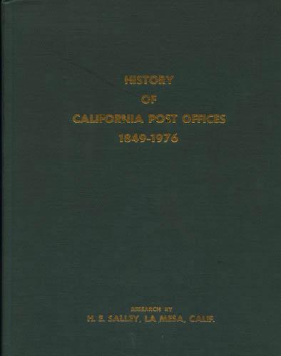 Salley, H.E.,History of California Post Offices, 1849-1976, 1977, 1st edition, hard bound, 301 pages, not illustrated but with very detailed notes. Nearly new. Shipping weight 2.8 lbs / 1.3 kilos. Estimate $30 - 40. Suggested Bid $30-40 (Image)