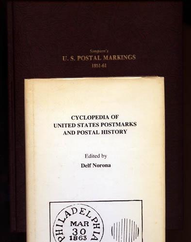 Simpson, Tracy W.,Simpson's U.S. Postal Markings 1851-1861, 1979, 2nd Edition, revised and enlarged by Thomas J. Alexander, hard bound, 434 pages, with black and white illustrations; without dust jacket, otherwise nearly new. Also Cyclopedia of U.S. Postmarks and Postal History, edited by Delf Norona, 1975 Quarterman reprint of the 1933-1935 original, 405 pages; dust jacket is slightly damaged otherwise nearly new. Two excellent references on postmarks. Shipping weight 5.6 lbs / 2.6 kilos. Estimate $30 - 40. Suggested Bid $30-40 (Image)
