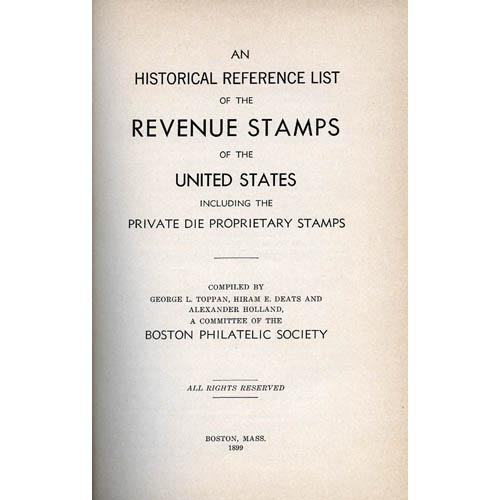 Toppan, Deats and Holland,Boston Revenue Book, An Historical Reference List of the Revenue Stamps of the U.S. Including the Private Die Proprietary Stamps, a reprint (c. 1920) of the 1899 original classic work on the subject, 446 pages, hard bound. In good condition. Shipping weight 1.5 lbs / 0.7 kilos. Estimate $30 - 40. Suggested Bid $30-40 (Image)