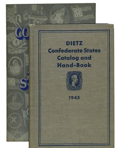 [Confederate States] Dietz, August,Confederate States Catalog and Hand-Book, 1945 edition, hard bound, 211 pages, illustrated in black & white, signed by August Dietz. Also Confederate States of America Stampless Cover Catalog, Benjamin Wishnietsky, editor, 1980 edition, soft cover, 93 pages. Both books are in relatively good condition (the Dietz book is a trifle aged). Shipping weight 1.75 lbs / 0.8 kilos. Estimate $30 - 40. Suggested Bid $30-40 (Image)