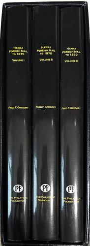 [Hawaii] Gregory, Fred F.,Hawaii Foreign Mail to 1870, published in 2012 by the Philatelic Foundation, hard bound, 3 volumes + slipcase, 1233 luxurious pages, profusely illustrated in color, with extremely detailed notes, maps and charts, this is a magnificent work by a major philatelist and the premier reference on the subject. Like new. Available from the PF for $250 + shipping. Shipping weight 13.75 lbs / 6.25 kilos. Estimate $100 - 150. Suggested Bid $100-150 (Image)