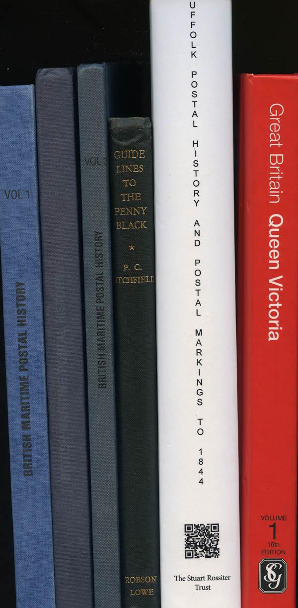 [Great Britain] Kirk & Cattell,British Maritime Postal History, published by Ted Proud in 1981 and later, 3 volumes, hard bound, with a few illustrations in black & white. Also Guide Lines to the Penny Black by P.C. Litchfield; Suffolk Postal History and Postal Markings to 1944, by Thomas Slemons, published in 2017, a thick book beautifully illustrated in color; and Gibbons G.B. Specialised Stamp Catalogue Volume 1, 16th edition, published in 2011. A useful lot for the Great Britain specialist. Shipping weight 12 lbs / 5.5 kilos. Estimate $30 - 40. Suggested Bid $30-40 (Image)