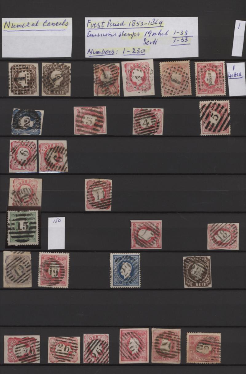 Portugal 1853/1920 (ca.), cancellations of the classic period. Collection in a thick stockbook comprising the numeral cancels, town cancels by cities and circular date cancels from 1880 to 1910. Hundreds of beautiful cancels, often centric, systematically collected and inscribed. Postal history at its best! Condition: o (used) (Image)